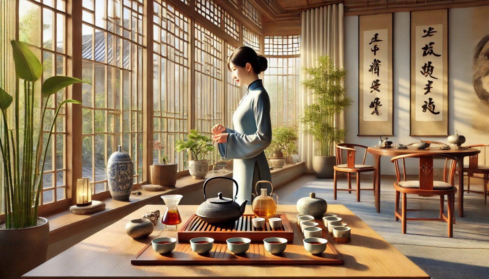 茶席应设在 安静、光线柔和 的环境中,避免嘈杂和过强的灯光。如果是在室内,可以选择靠窗的位置,以便借助自然光。如果是在户外,可以选择庭院、阳台等环境,使客人能感受到茶与自然的融合。