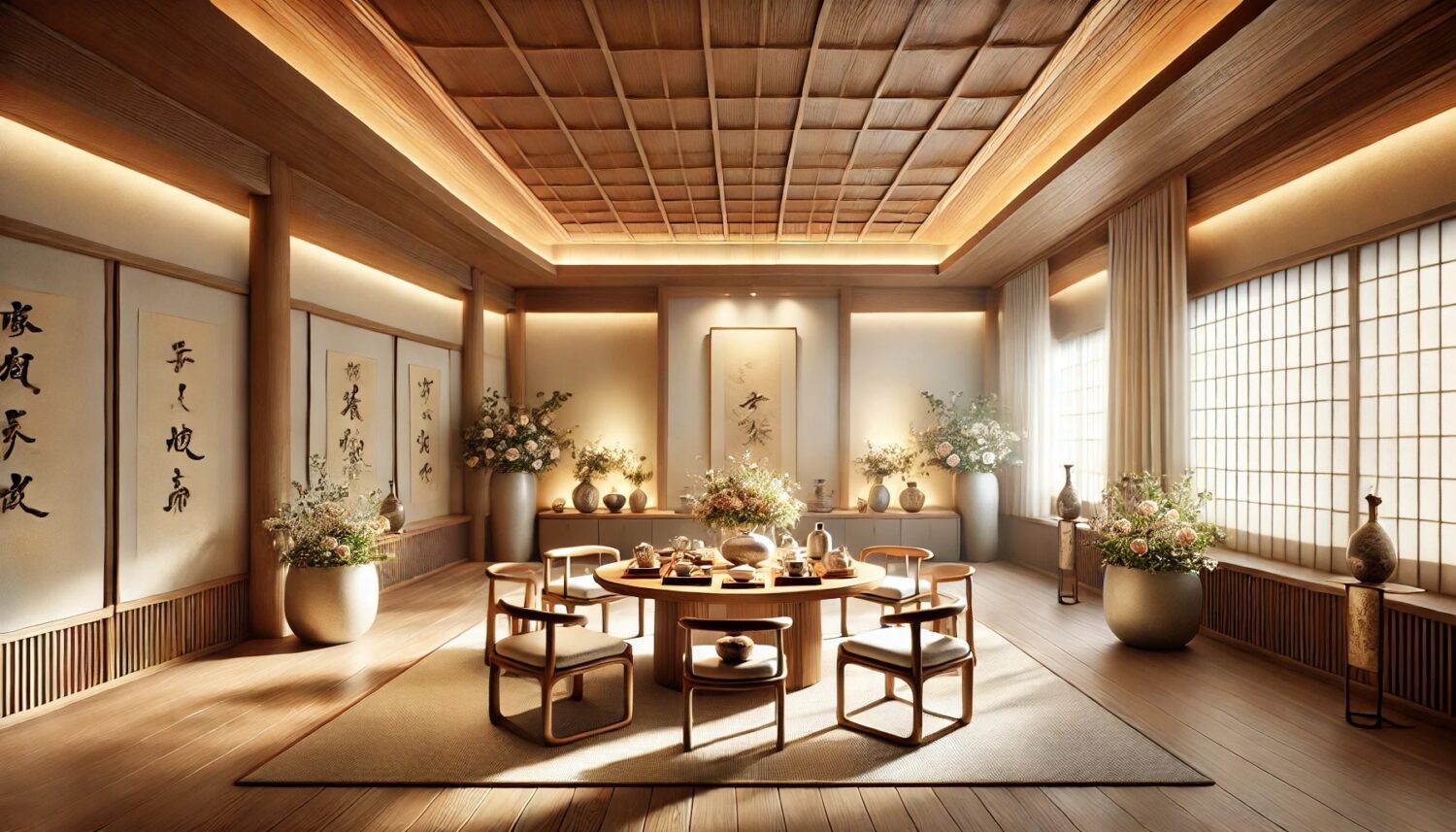 茶席是一个讲求舒适和沉浸感的空间,因此灯光不宜过强或过于刺眼。可以选择柔和的漫反射光源,避免直射灯光造成不适。同时,光源的位置也需合理安排,尽量避免茶具产生过多反光,影响视觉体验。