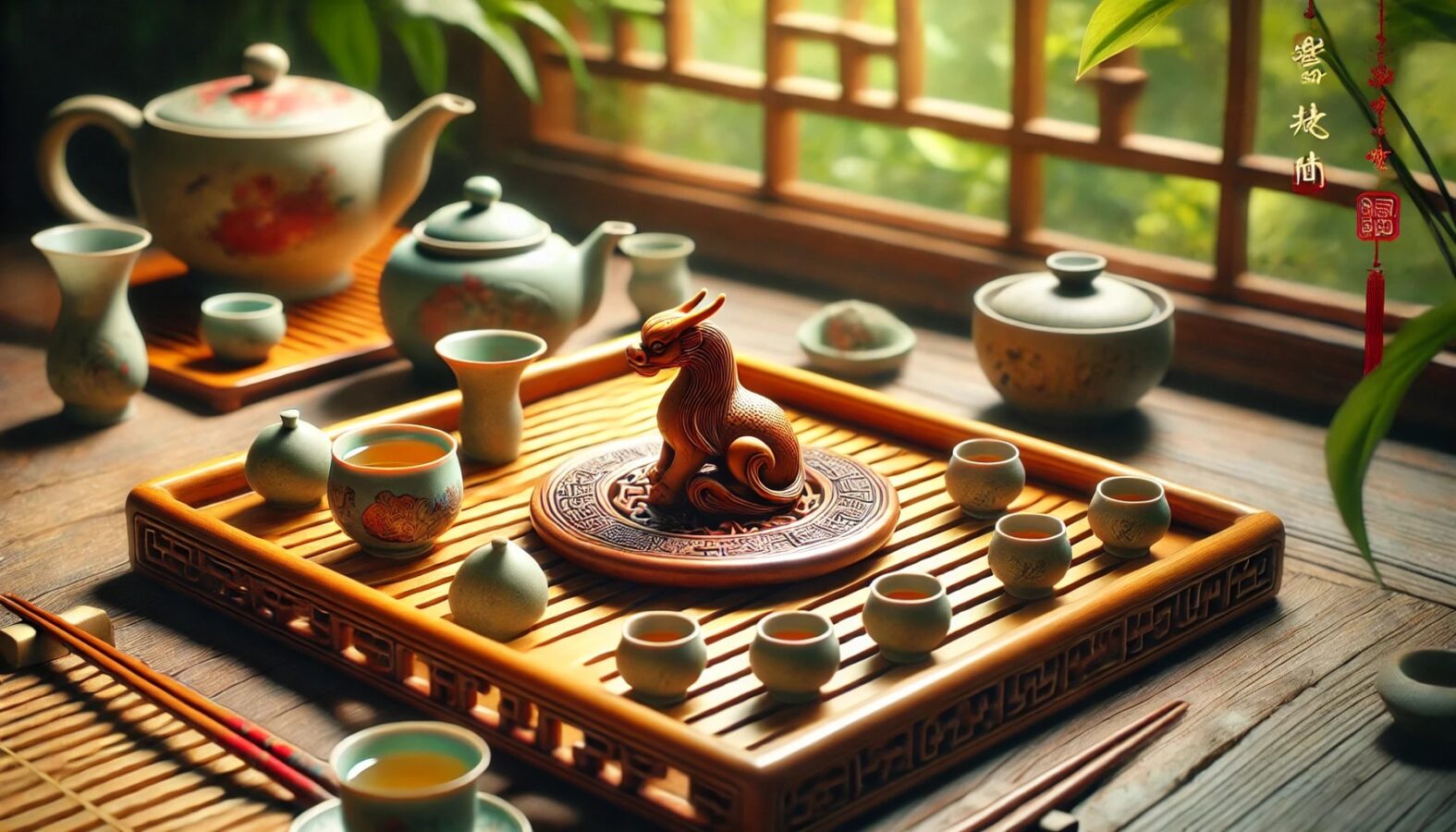 貔貅:适合摆放在茶席靠近主人的一侧,头部朝向门外,象征吞财聚财,同时也能驱邪避灾。