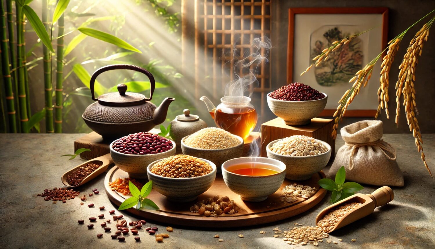 五谷杂粮(如糙米、燕麦、薏米、红豆、黑米、荞麦等)是重要的膳食纤维、蛋白质和矿物质来源,能够促进消化、稳定血糖、增强饱腹感。然而,一些杂粮的口感较为粗糙,或含有植酸、单宁等成分,可能影响矿物质吸收。茶叶富含茶多酚、氨基酸、咖啡因等成分,能够调和五谷杂粮的风味,促进消化,并提高整体营养价值。