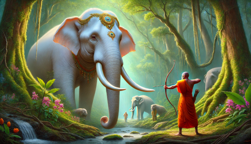 眼看着王后整日忧愁,茶不思、饭不想,身体日渐瘦弱,容貌枯槁。国王心里发慌,乃召集群臣会商,其中有一位臣子表示,他曾听闻有六牙白象。国王立即下达命令征召全国猎士,进一步探问此象踪迹。结果,一位南方射师说,他去世的父亲确实见过这种白象,但在非常遥远的地方,很难找得到!于是,夫人指示这位射师:「你向南走三千里,将会看到一座高山,往山里再走二天就可以遇到这只白象,当你发现白象出入必经之地,就在道旁挖掘坑洞。你必须剃除须发,穿著袈裟,装扮成出家人的模样,躲在坑里,因为这只白象对三宝十分恭敬。等到白象经过时,你就可以射杀它,拔取象牙回宫。」