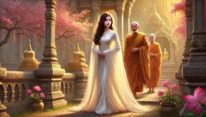 The monks, seeing this extraordinary event, asked the Buddha about the past-life causes. The Buddha replied: “Long ago, during the time of Kassapa Buddha, that Buddha explained to his disciples the nature of the Five Defilements. At that time, more than a thousand Brahmins and lay elders made a vow together: ‘May we in the future encounter Śākyamuni Buddha!’ The Brahmins of that time are the five hundred Brahmins of today, and the elder of that time is Elder Beautiful Voice. Because of these karmic conditions, upon seeing me today, they attained realization.”