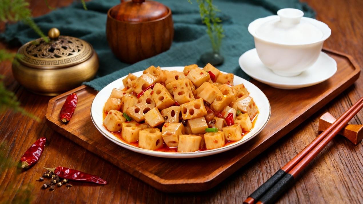 Spicy stir-fried lotus root cubes are a crunchy and flavorful vegetarian dish...