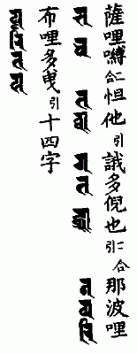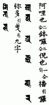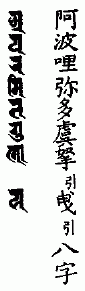 那谟(引)婆誐嚩帝(引一句)阿哩也(二合)钵啰(二合)倪也(二合引)播(引)啰弥多(引)曳(引二)阿波哩弥多虞拏(引)曳(引三)薄讫底(二合)嚩蹉逻(引)曳(引四)萨哩嚩(二合)怛他(引)誐多倪也(二合引)那波哩布哩多(引)曳(引五)萨埵嚩蹉逻(引)曳(引六)怛[寧*也](切身)他(引七)唵(引)提(引八)率噜(二合)底(九)娑蜜哩(三合)底(十)尾惹曳(引十一)莎(引)贺(引十二)